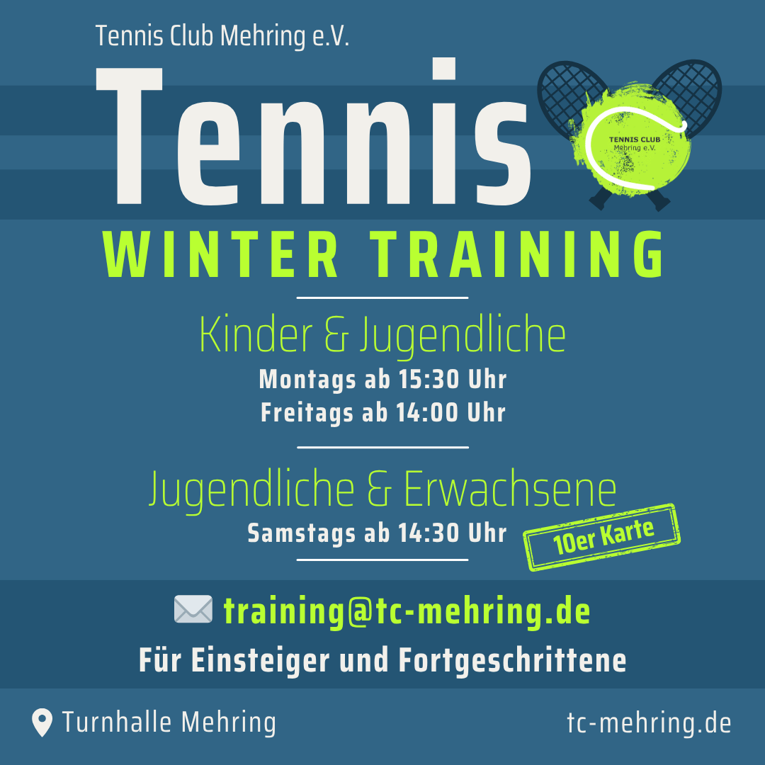 Für das Samstagstraining am Nachmittag gibt es noch freie Plätze. Die Teilnahme erfolgt dabei ganz flexibel über eine 10er-Karte. Interessierte Spielerinnen und Spieler können sich jederzeit unter training@tc-mehring.de melden.